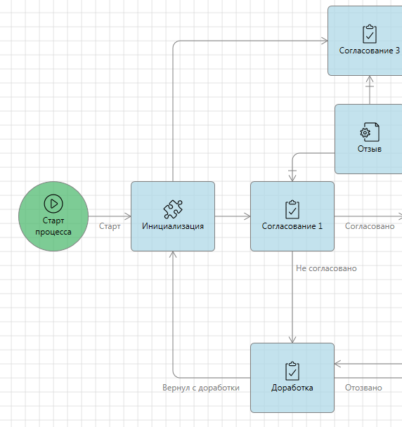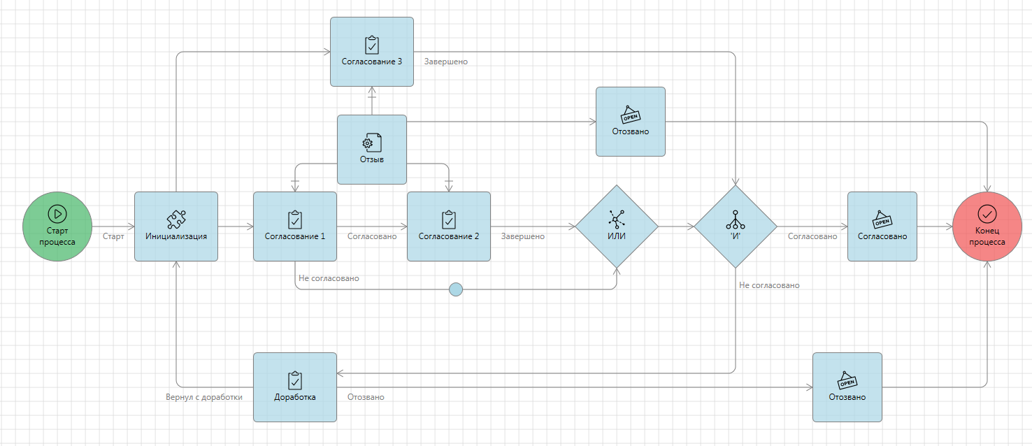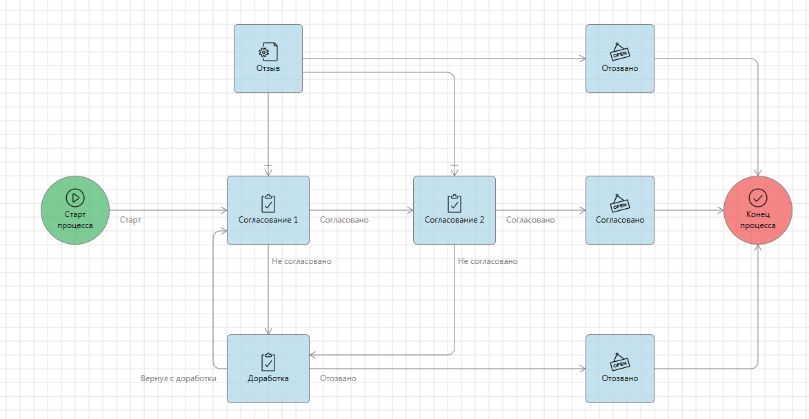 В итоге мы получили процесс с двумя последовательными согласованиями, сменой состояний, отправкой уведомления и отзывом согласования.