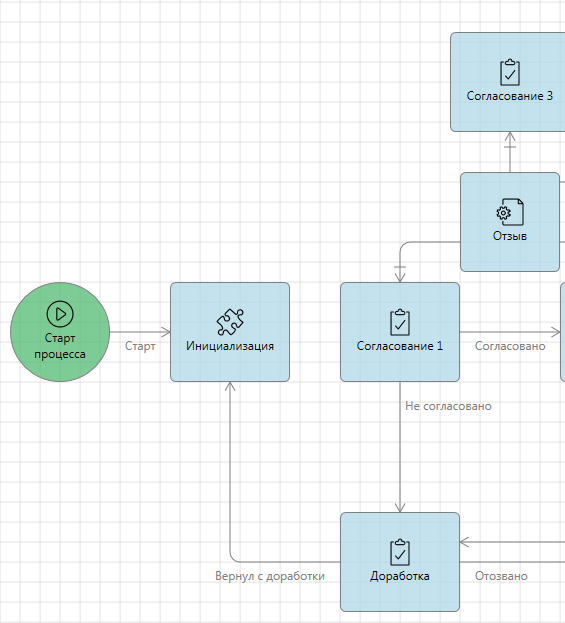Все связи, что раньше переходили в первый узел согласования (кроме связи из узла Отзыв), перенесем на узел Инициализация.