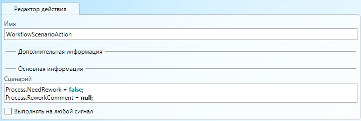 Действие Старт процесса дополнительно настраивать не нужно, т.к. по умолчанию оно ожидает сигнал с типом Start, который мы указали для нашей кнопки запуска процесса.