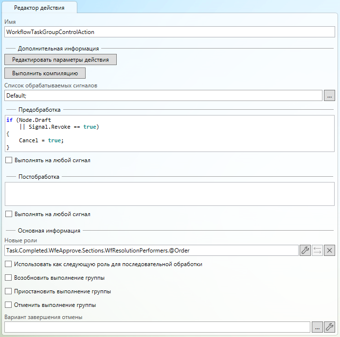 Теперь доработаем сам процесс. Добавим новый узел Отзыв с действием Управление заданием, из которого мы будем отправлять сигнал с отзывом задания в узлы согласования. В настройки узла укажем в поле Подписки узла по умолчанию тип сигнала Revoke. В само действие мы настроим так, чтобы оно завершало задание с вариантом Отозвано.