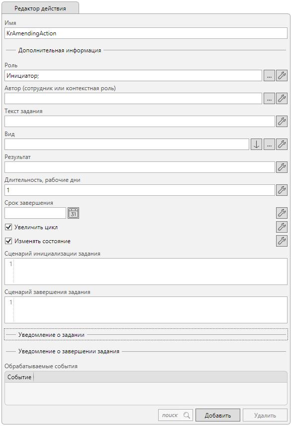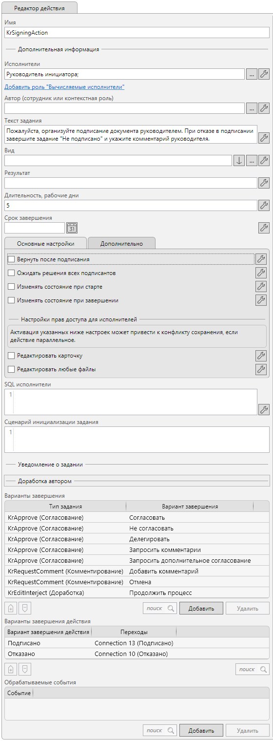 Это пример поэтапного создания процесса со своими настройками, где используется стандартное действие “Задание”. Однако для заданий согласования и доработки удобно использовать соответствующие действия из группы “Маршруты”, т.к. в них уже заложено много функциональности, например, запрос дополнительного согласования, делегирование и т.п. Примеры с использованием действий группы “Маршруты” описаны в следующем разделе.