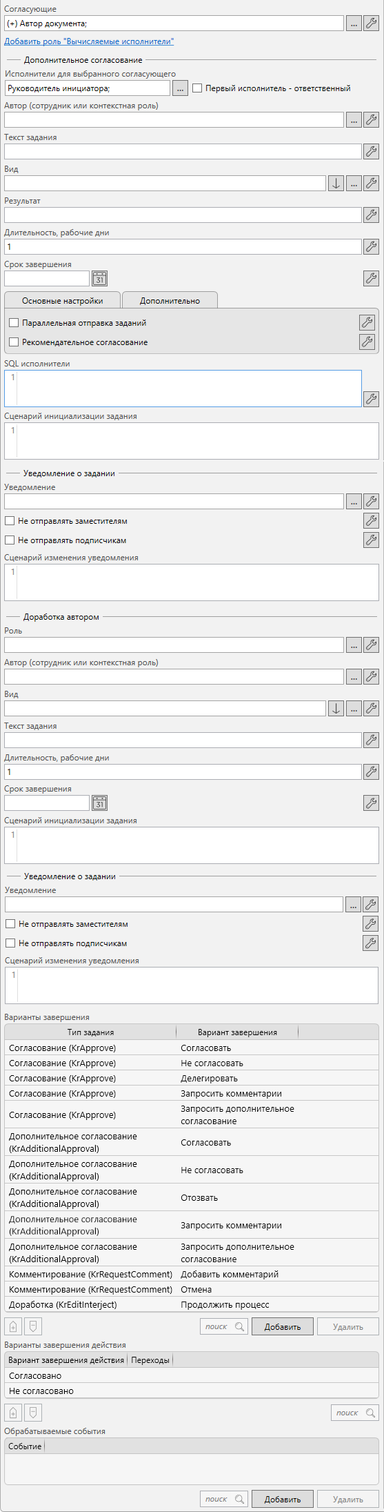 Согласующие (значение из справочника ролей, может быть привязано к параметрам процесса) – согласующие текущего действия. Можно указать как конкретных сотрудников, так и роли.