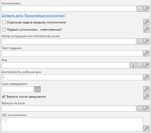 Исполнители (значение из справочника ролей, может быть привязано к параметрам процесса) – исполнители задания. Можно указать как конкретных сотрудников, так и роли.
