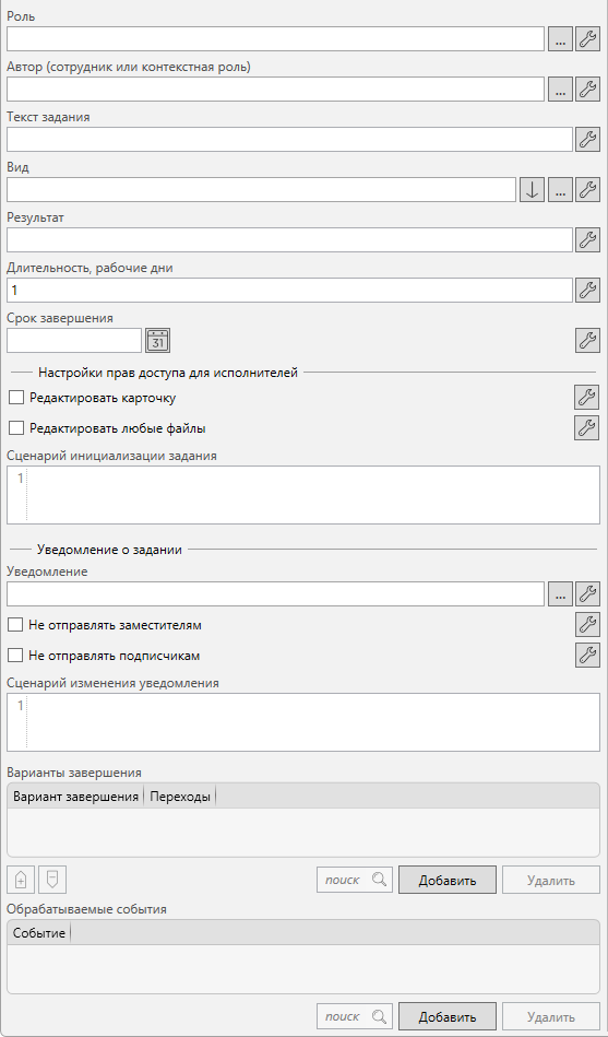 Варианты завершения (таблица) - содержит настройки обработки заданий при их завершении по вариантам завершения. Если таблица пуста, то при открытии редактора действия она заполняется вариантами завершения обрабатываемых данным действием типов заданий. Информация о составе вариантов завершения считывается из метаданных обрабатываемых действием типов заданий.