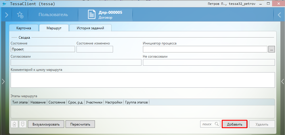На данной вкладке можно создать/отредактировать маршрут для согласования договора.