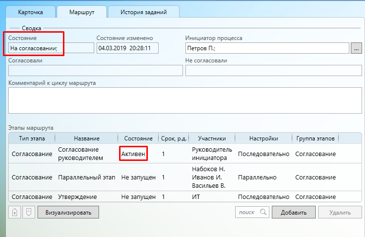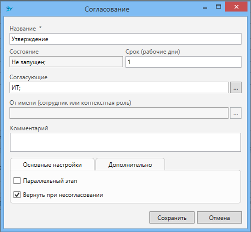 • Состояние – состояние этапа. Не доступно для редактирования, меняется автоматически по ходу процесса согласования;