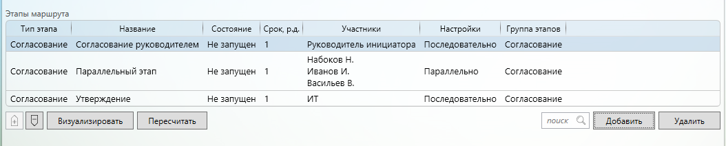В системе есть возможность настроить шаблоны этапов маршрута (настраиваются Администраторами системы).