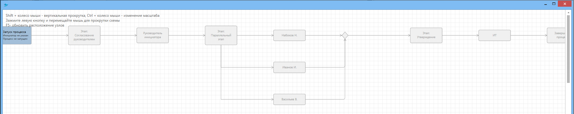 После создания маршрута согласования карточку необходимо сохранить (см. Сохранение карточки). Далее созданный маршрут можно просмотреть с помощью автоматического визуализатора, нажав на кнопку “Визуализировать”.