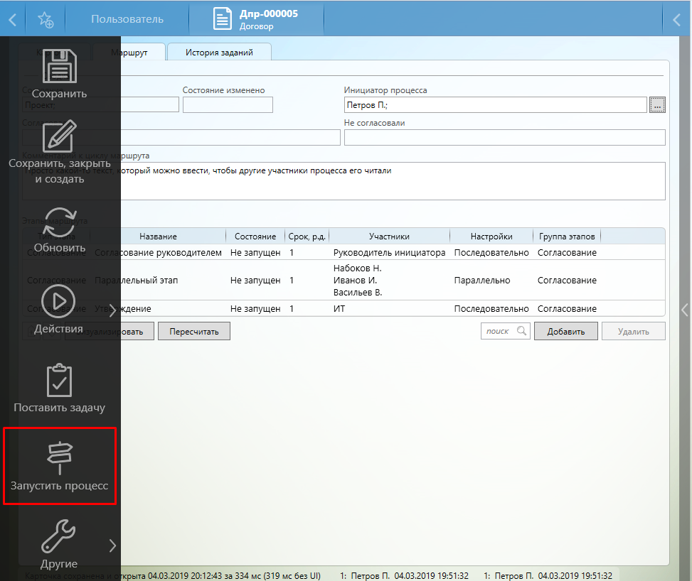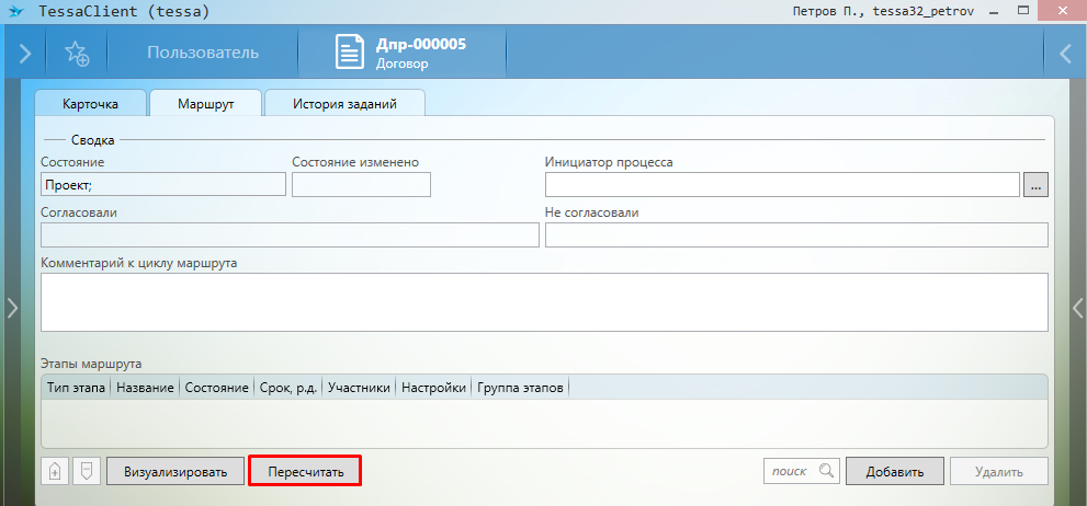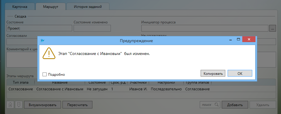 Если в системе есть настроенные шаблоны этапов, то сотруднику не обязательно добавлять какие-то этапы вручную и выполнять пересчет, а с пустой таблицей этапов маршрута можно запустить процесс. При этом в таблицу добавятся нужные этапы и появится окно, сообщающее, что в маршруте есть изменения.
