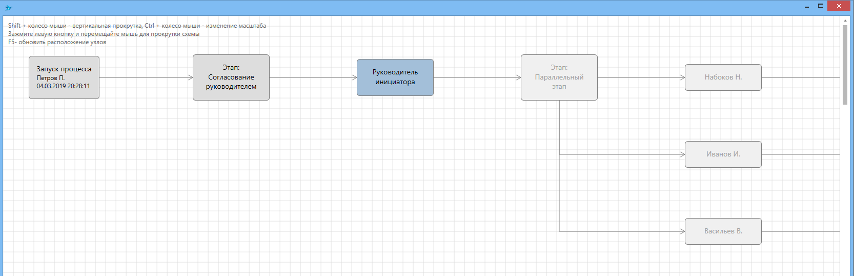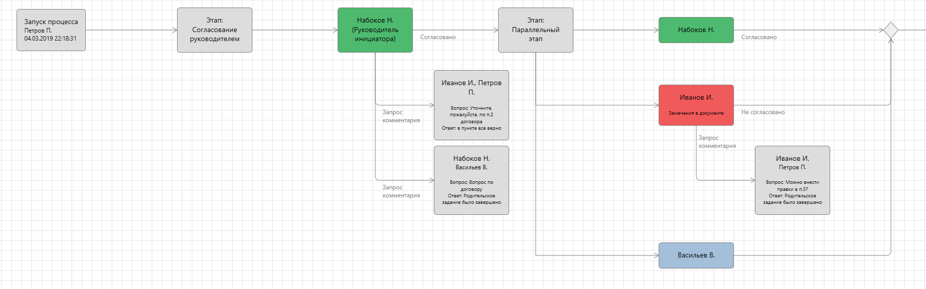 А также, при нажатии на кнопку “Визуализировать”, откроется окно визуализации процесса согласования/подписания, где отображен ход процесса согласования/подписания, включая запросы комментариев и делегирование, различные этапы будут подсвечены цветом в соответствии с состоянием этапа: