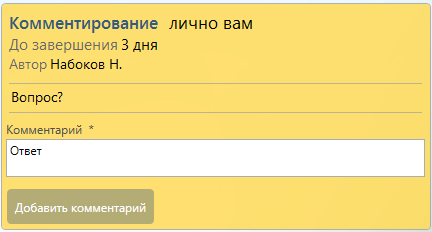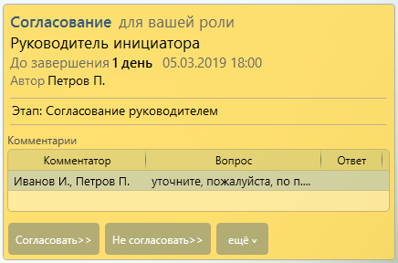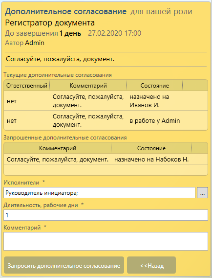 До вынесения решения по документу у дополнительного согласующего есть возможность запросить комментарии или запросить дополнительное согласование для текущего задания дополнительного согласования.