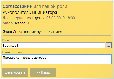 • Вернуть при несогласовании – вернуть договор на доработку инициатору при несогласовании хотя бы одним из согласующих.