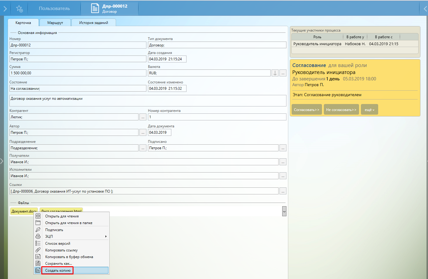 Процесс согласования для всех типов документов аналогичен. В данном руководстве процесс согласования документов рассмотрен на примере согласования карточки договора.