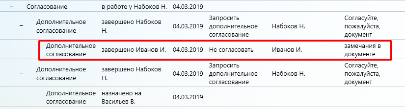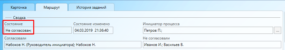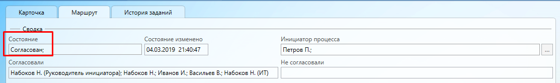 Если все этапы были завершены и были не согласовавшие, документ перейдет в состояние “Не согласован”, что будет отражено в соответствующем поле.