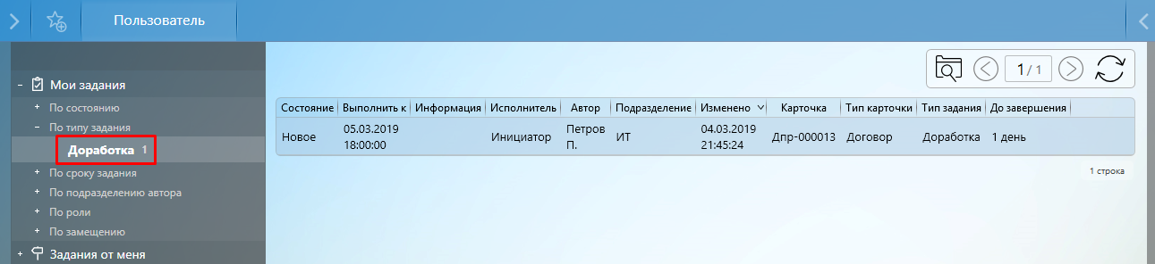 Все карточки, где имеются задания на доработку договора можно просмотреть в представлении “Мои задания” → “По типу задания” → “Доработка”.