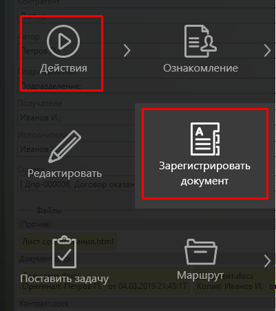После того, как договор успешно согласован (состояние договора – “Согласован”), договор можно зарегистрировать. Открыв карточку нужного договора в левом меню системы нажать на “Действия” → “Зарегистрировать документ”.