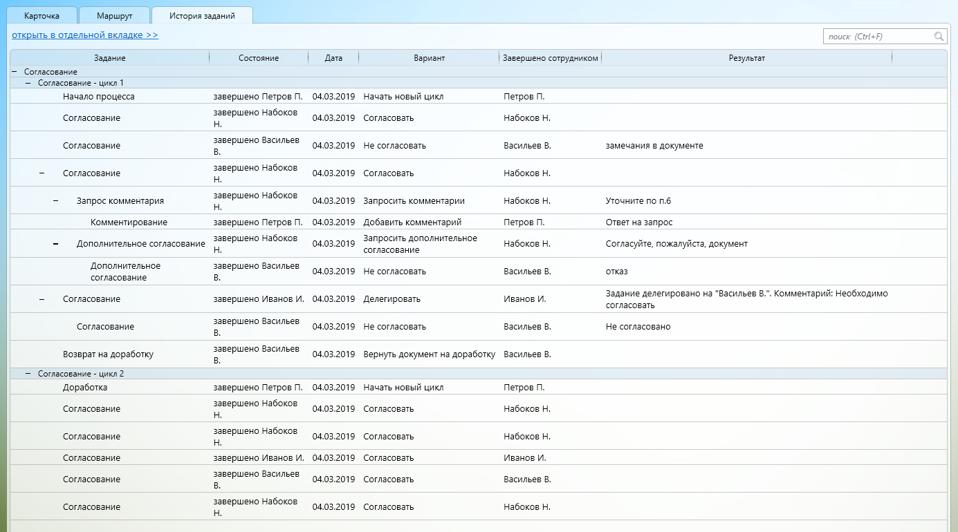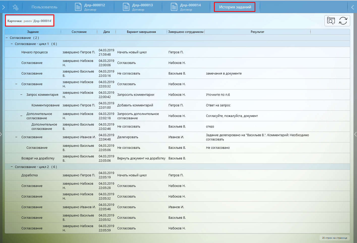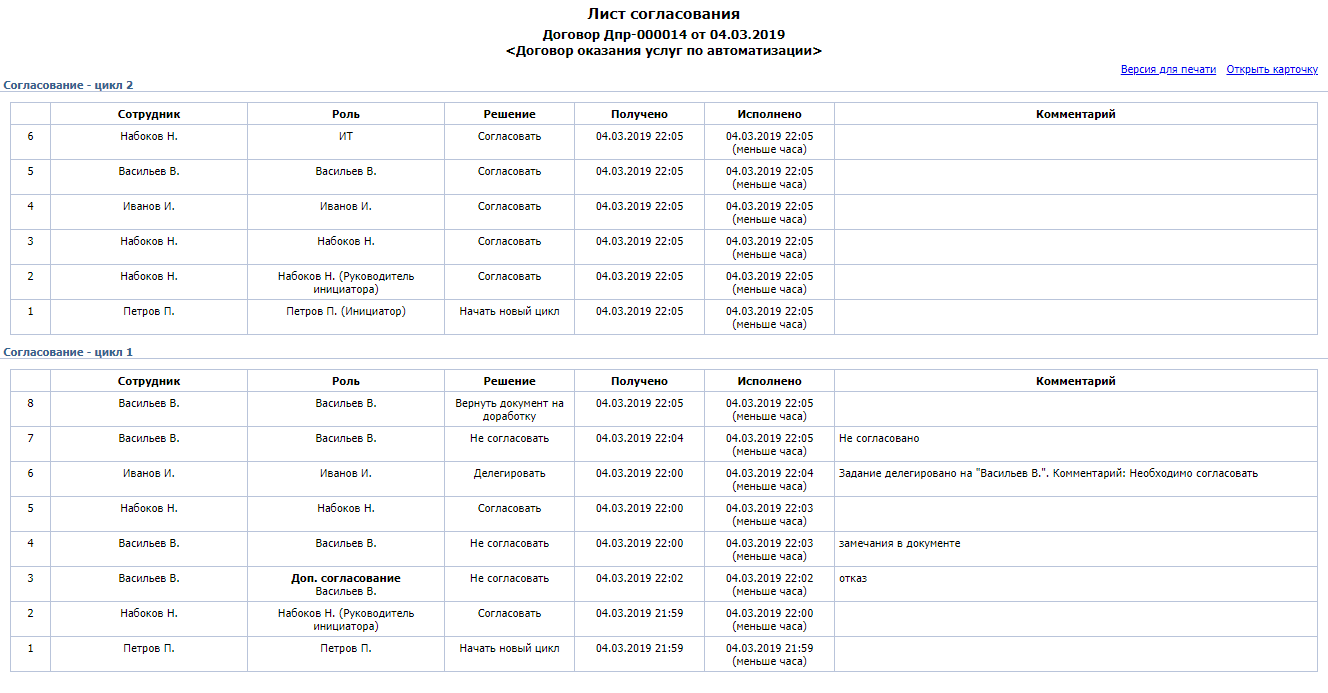 Каждый цикл согласования представлен отдельным блоком, содержащим таблицу о действиях, совершенных в рамках процесса.