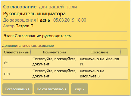 Обратите внимание, что согласующий, для которого указаны дополнительные согласующие, отмечается в списке специальными символами (+) перед названием роли: