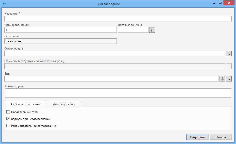 • Параллельный этап – флаг выставляется в случае, если текущий этап согласования должен проходить параллельно (актуально, если в поле “Согласующие” указано более одного согласующего);