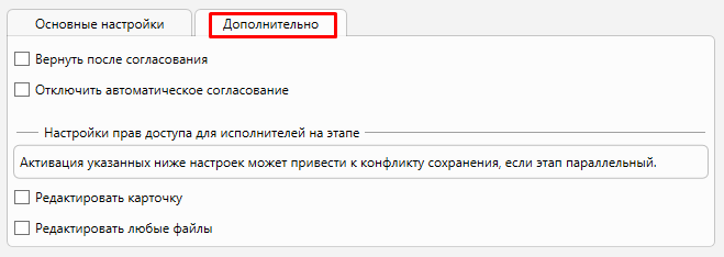 • Отключить автоматическое согласование - отключить для данного этапа автоматическое завершение задания согласования (см. Автоматическое согласование);