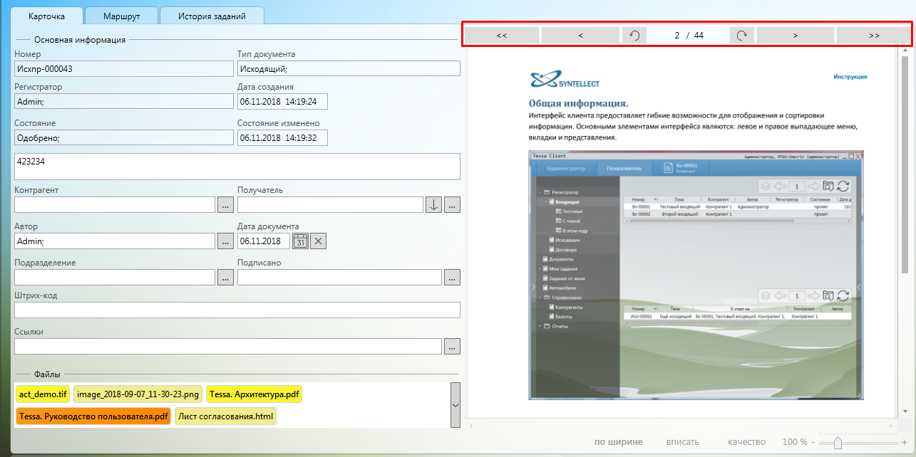 При использовании области предпросмотра для pdf и tif файлов, отображаются дополнительные кнопки для пролистывания и поворота страниц.
