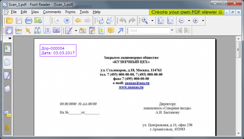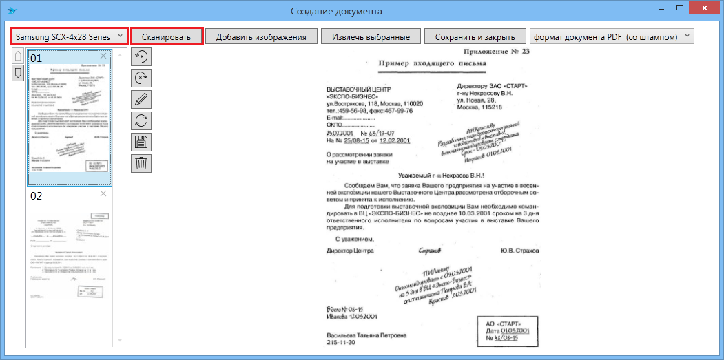 “формат документа PDF (со штампом)” - сохранение всех изображений в результирующий PDF файл с простановкой штампа в верхней левой части каждой страницы. В штампе содержится номер и дата - данные из карточки. Например: