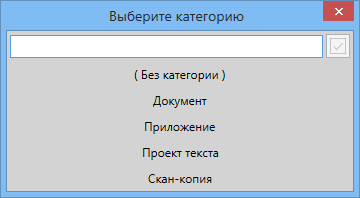 Включить использование категорий, а также настроить категории, доступные для выбора пользователю, могут Администраторы системы (см. Руководство администратора). Так же можно выбрать категорию, введенную вручную (если данная возможность включена для текущего вида документа). Для этого в текстовое поле в верхней части окна нужно ввести имя новой категории и нажать кнопку с галочкой или клавишу [Enter] на клавиатуре.