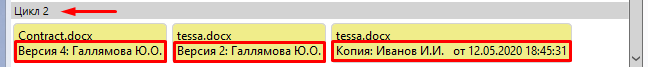 а в разделе с названием цикла отображаются созданные копии документов (с указанием ФИО создавшего и даты создания), а также виртуальные файлы - ссылки на версии согласуемых документов, которые редактировались или добавлялись в данном цикле. Т.е. всегда можно посмотреть на каком цикле какие документы были добавлены/отредактированы и как они выглядели в момент выполнения данного цикла маршрута.