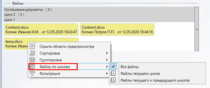 При включенной группировке по циклу согласования в контекстном меню секции файлов появляется дополнительный пункт для выбора режима отображения файлов по циклам:
