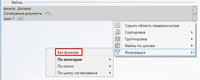 Фильтрация – позволяет отфильтровать элементы списка файлов по определенному признаку (категория, тип, цикл согласования).