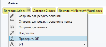 Проверить ЭП на файле можно с помощью контекстного меню, вызываемого нажатием правой кнопкой мыши на файле.