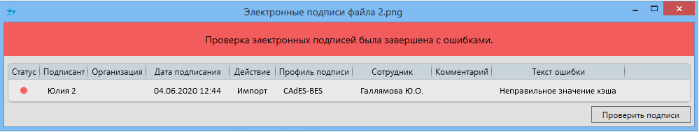 В случае, если проверка пройдет не успешно, в колонке статус подпись отметится красным и будет отображен текст ошибки.