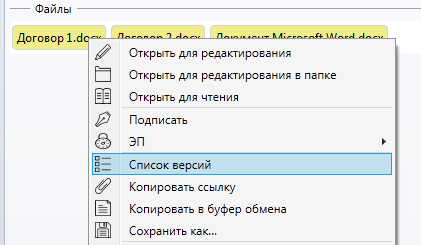Список версий также открывается при помощи соответствующего пункта контекстного меню файла. Элементы списка версий так же имеют пункты “Открыть для чтения”, “Копировать ссылку”, “Сохранить как” и “Копировать в буфер обмена”. Двойное нажатие левой кнопки мыши на элементе списка версий вызывает открытие для чтения.