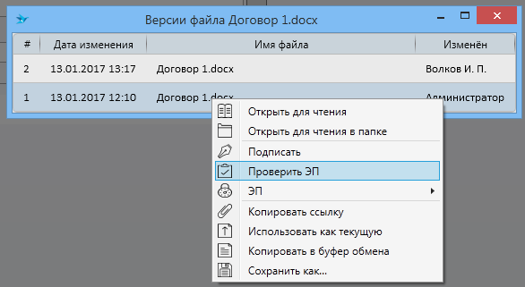 Также есть возможность проверить подписи для предыдущих версий файла. Для этого вызываем список версий файла.