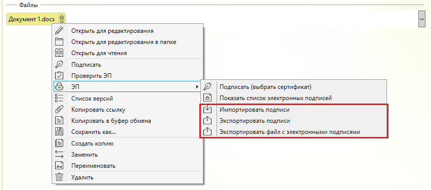 Для экспорта/импорта подписи необходимо выбрать соответствующий пункт контекстного меню на файле.