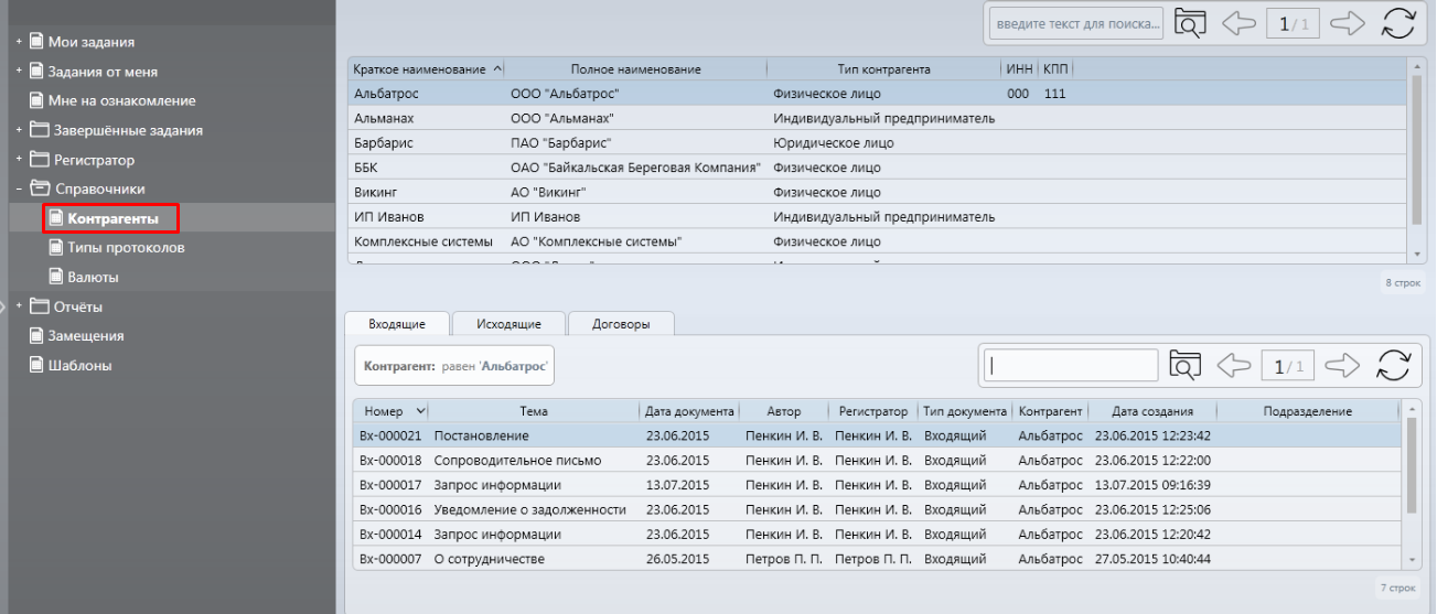 В нижней области справочника отображаются все карточки документов по выбранному в списке контрагенту. Все доступные документы сгруппированы по вкладкам - типам документов.