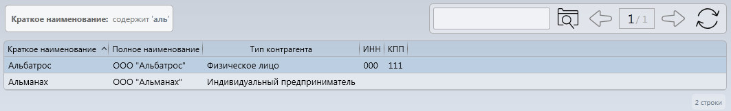 Для быстрого поиска по краткому наименованию контрагента можно в соответствующее поле ввести часть названия