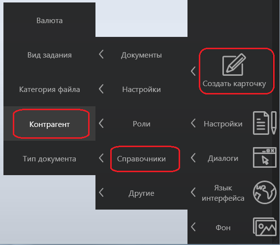 Создать новую карточку контрагента можно с помощью правого меню системы “Создать карточку” → “Справочники” → “Контрагент”.