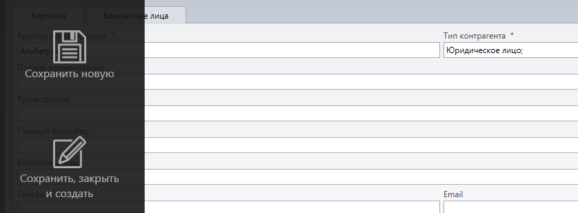 Далее карточку сохранить, нажав на кнопку “Сохранить новую” (либо “Сохранить, закрыть и создать”, если требуется создание еще одной карточки контрагента), расположенную в левом меню системы.
