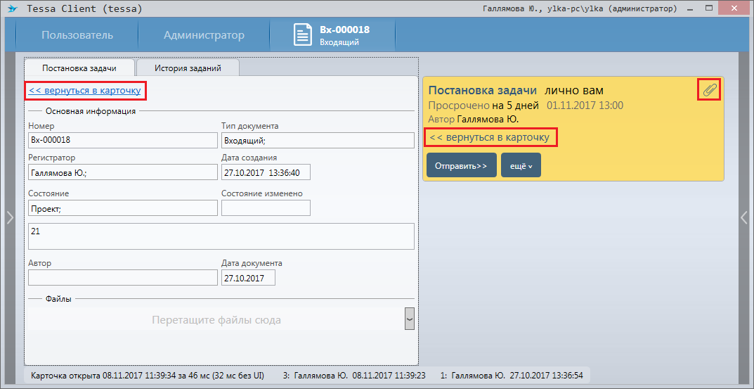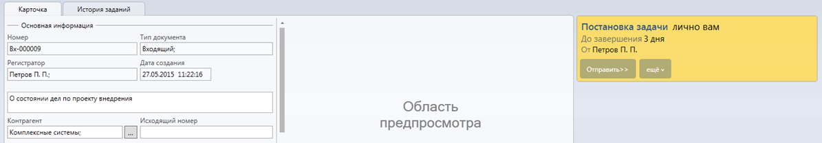 Как было сказано выше, задачи создаются только в контексте карточки какого-либо документа, однако задача - это отдельная карточка, к которой могут быть приложены дополнительные файлы и по которой можно смотреть историю исполнения.