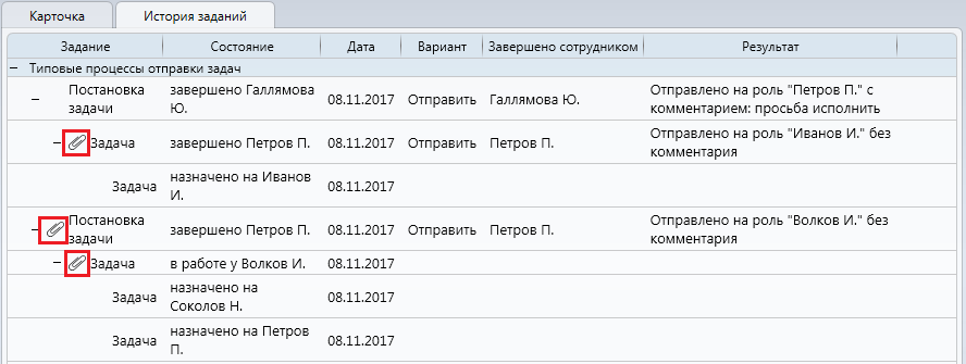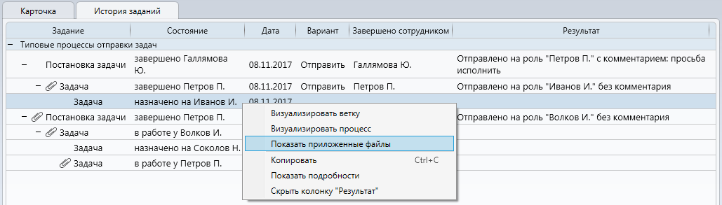 Пиктограмма с изображением скрепки отображается только в тех строках истории, где исполнителем был приложен хотя бы один файл к карточке задачи. Чтобы перейти к карточке какой-либо задачи, где не приложено ни одного файла, необходимо вызвать контекстное меню на нужной строке в истории заданий и выбрать пункт “Показать приложенные файлы” - будет выполнен переход в карточку выбранной задачи.