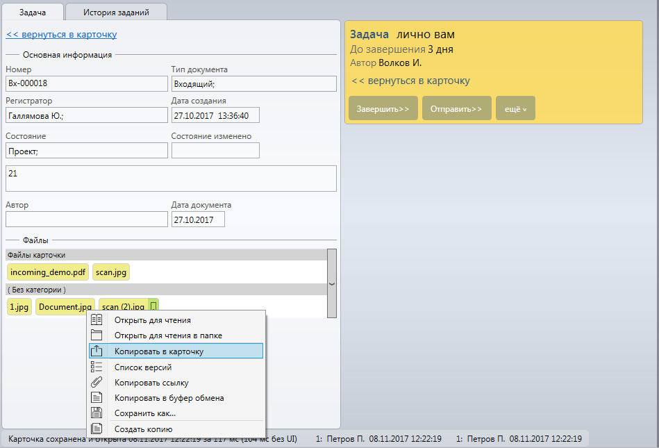 Все файлы, добавляемые в карточки задач, не отображаются в секции файлов карточки документа. При необходимости, файлы из карточки задачи можно скопировать в родительскую карточку документа (скопировать получится, только если у вас есть права на создание файлов в карточке документа). Скопировать можно любые файлы: как добавленные вами, так и добавленные другими исполнителями. Копирование производится с помощью контекстного меню на файле в карточке задачи.