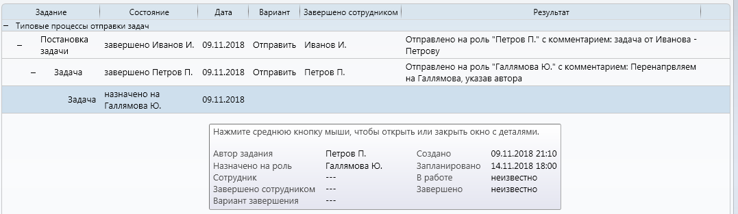 3. Сотрудник Галлямова Ю., как Исполнитель завершает свою задачу, после чего сотрудник Петров П. получает задачу на контроль исполнения: