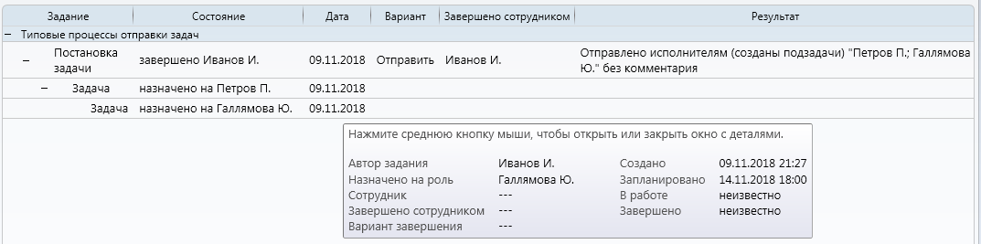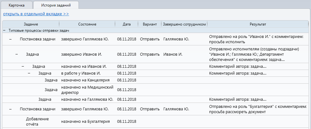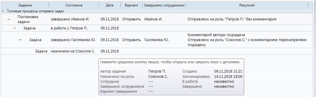 Этот пример похож на предыдущий, однако тут Автором подзадачи является Иванов. Если смотреть по истории заданий, то она идентична предыдущему примеру, но в данном случае Автором подзадачи остался Иванов, т.к. подзадача, отправленная таким способом, относится к той же ветке дерева задач, что и родительская.