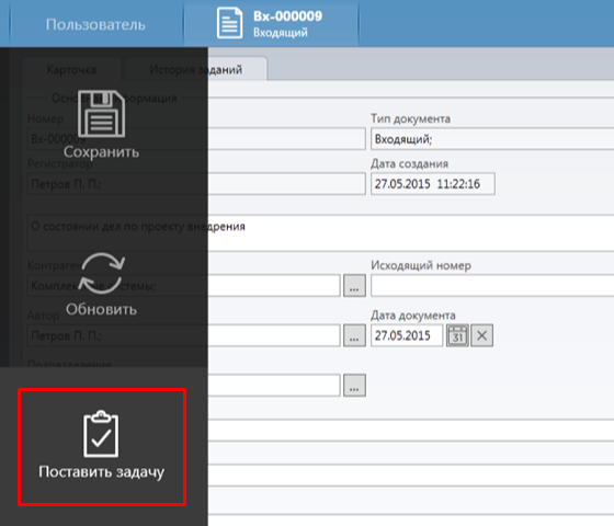 Создать задачу можно по любой существующей в системе карточке (если для данного вида настроена возможность создания задач и при наличии соответствующих прав доступа у текущего пользователя). Для создания новой задачи необходимо открыть нужную карточку и в левом меню системы выбрать “Поставить задачу”.