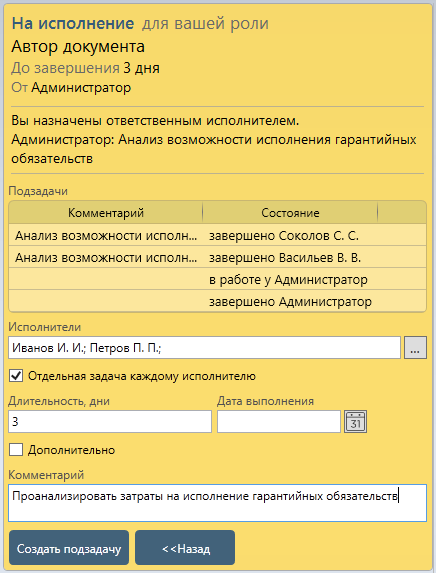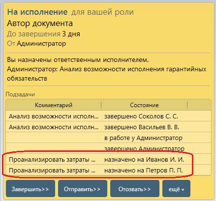 Таким образом, по карточке можно создать несколько задач, отправив их необходимым сотрудникам и ролям. По каждой задаче можно отправить несколько подзадач.