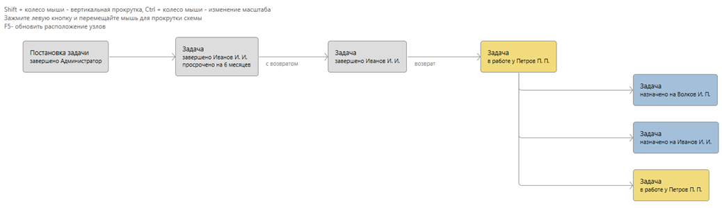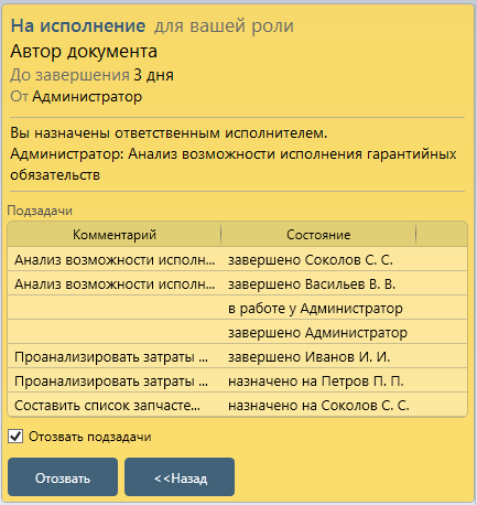 На данном примере мы видим, что, несмотря на то, что Петров перенаправлял задачу и являлся Контролером, Автором задачи все время был Иванов, который, собственно, инициировал процесс исполнения задачи. Однако задачу на контроль исполнения получает не Автор родительской задачи, а тот, кто ставил задачу на контроль (либо тот, кого указали в поле “Вернуть на роль”, если это поле было заполнено).