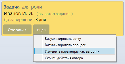 У автора задачи есть возможность изменить параметры отправленной задачи: исполнителя, срок исполнения, комментарий. После нажатия кнопки “Действия автора” нажав на кнопку “еще” в меню необходимо выбрать “Изменить параметры как автор”.