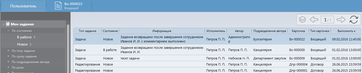 После исполнения задачи исполнителем и если в задаче был выставлен флаг “Вернуть после завершения”, указанный в задаче сотрудник получает задачу. Все карточки, где имеются задания, возвращенные после исполнения можно просмотреть в представлении “Мои задания”.