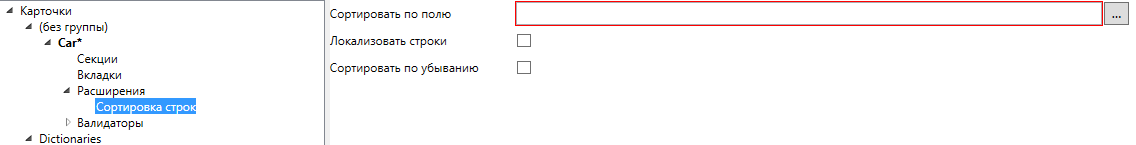 Расширение типа для сортировки строк. Позволяет производить сортировку строк в табличной секции по указанному в настройках полю из строки этой секции. Также позволяет производить локализацию значений перед сортировкой, чтобы отсортированные значения были упорядочены с учётом выбранного языка. Данный режим включается при установке флага “Локализовать строки”. По умолчанию направление сортировки - по возрастанию, но можно изменить направление, поставив флаг “Сортировать по убыванию”.